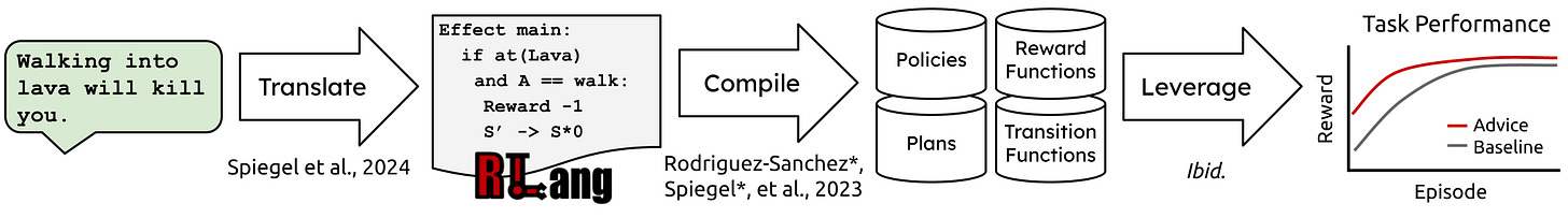 What follows is that the meaning of language should be represented in terms that ground to structured decision-making. My first crack at this was to develop a semantic logical form for natural language that compiles into statements about structured MDPs and their solutions (Rodríguez-Sánchez et al., 2023)1, and then to translate natural language into this logical form using large language models (Spiegel et al., 2024). By grounding the meaning of language to decision-theoretic terms, I was able to demonstrate how a wide variety of language advice could be understood natively by a learning agent, extending the semantics of language to decision-making.
